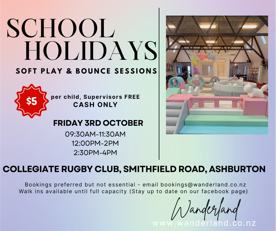 Looking for something to do with the kids these school holidays in Ashburton Mid Canterbury. We are hosting play sessions at Collegiate Rugby Club on the 3rd of October.